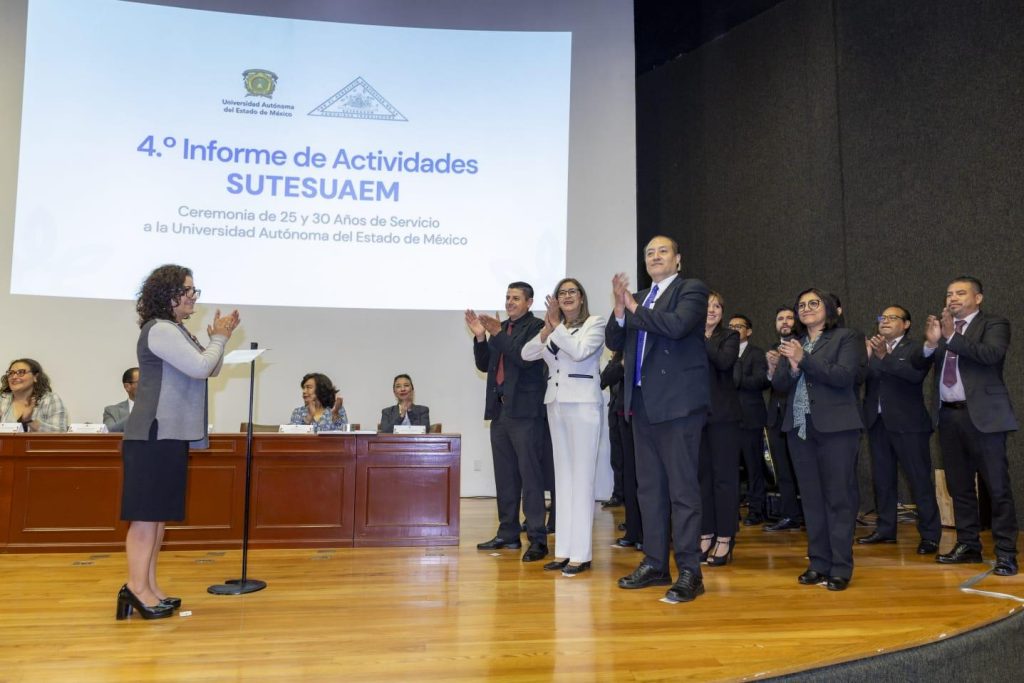 En el acto en el que también encabezó el cuarto informe de actividades del secretario general saliente de la agrupación sindical universitaria, Pedro Rodríguez Magallanes, y la entrega de reconocimientos a trabajadoras y trabajadores con 25 y 30 años de servicio, quienes con su esfuerzo y trabajo diario favorecen el desarrollo integral de la Autónoma mexiquense, la rectora reiteró apertura al diálogo y cercanía para la consolidación de una mejor institución.