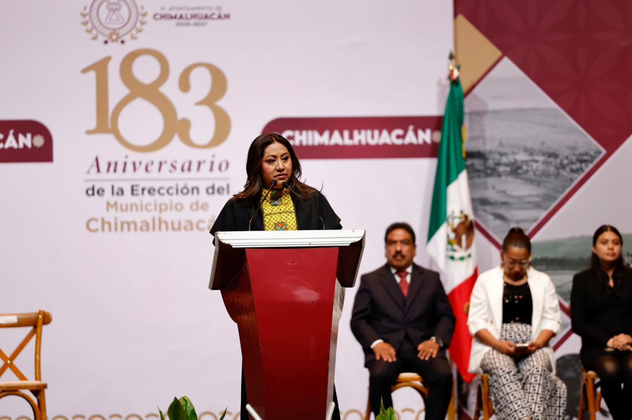 Chimalhuacán, Méx.- “Hace 183 años se consolidó formalmente la voluntad de nuestro pueblo. Se formalizó nuestra identidad política y legal como municipio, herencia que se remonta a tiempos prehispánicos, cuando nuestros ancestros habitaron esta tierra, conocida como ‘lugar de los escudos y rodelas’”, expresó la alcaldesa Xóchitl Flores Jiménez al encabezar la ceremonia por el 183 aniversario de la erección de Chimalhuacán.