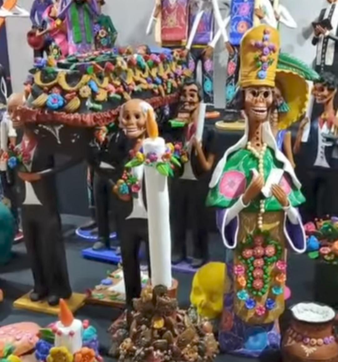 La pieza central está elaborada con figuras moldeadas y pintadas a mano, en las que invaden los colores de la tierra, detalles y reflejan las actividades diarias, así como la sinergia con la muerte.