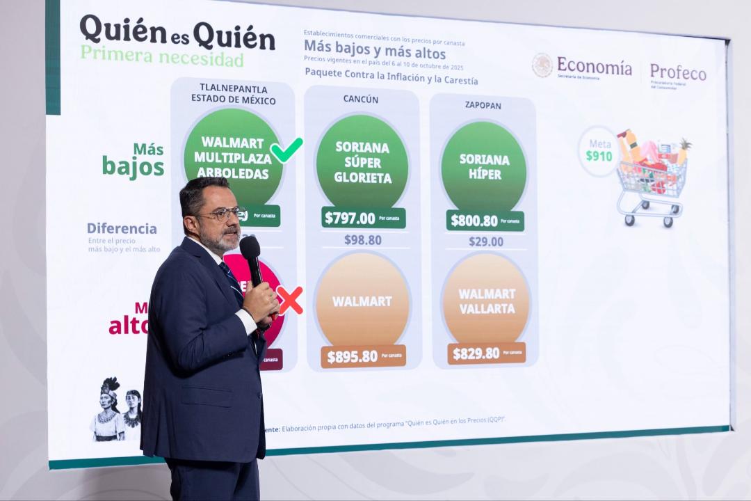 En las ciudades monitoreadas —Tlalnepantla, Cancún y Zapopan— los precios se mantuvieron dentro del rango establecido. En Cancún, por ejemplo, el precio más bajo fue de $797 pesos en Soriana Súper Glorieta, mientras que el más alto fue de $895.80 pesos en Walmart, aún por debajo del límite de $910.