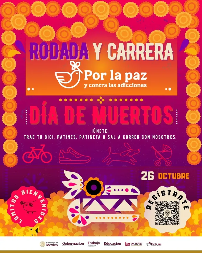 Ciudad de México.- El Instituto Mexicano de la Juventud (IMJUVE) invita a las juventudes de todo el país a sumarse a la segunda edición de la Rodada y Carrera por la Paz y Contra las Adicciones, que este año se realizará con una temática especial de Día de Muertos y promete una jornada llena de color, energía y participación comunitaria.