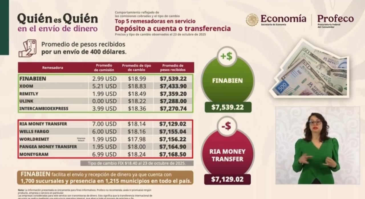 El 27 de octubre, durante la “Conferencia del Pueblo”, encabezada por la presidenta Claudia Sheinbaum Pardo, el titular de la PROFECO, Iván Escalante Ruiz, destacó que FINABIEN es la opción “más económica” del mercado, gracias a su baja comisión y a un tipo de cambio altamente competitivo. Esta combinación ha permitido que los envíos de dinero realizados a través de la Financiera generen un mayor valor para los hogares que dependen de las remesas.