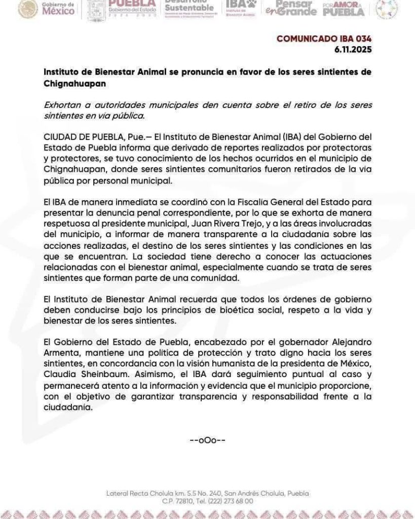 El Instituto de Bienestar Animal (IBA) anunció una denuncia formal ante la Fiscalía General de Justicia (FGE) por este maltrato, que reflejó la apatía, descuido, ignorancia y estulticia de la gestión de Rivera Trejo sobre cómo un ayuntamiento debe tratar a dichos seres sintientes. Es grave que el edil de un Pueblo Mágico tan turístico, como éste, no sepa qué hacer con los animales callejeros.