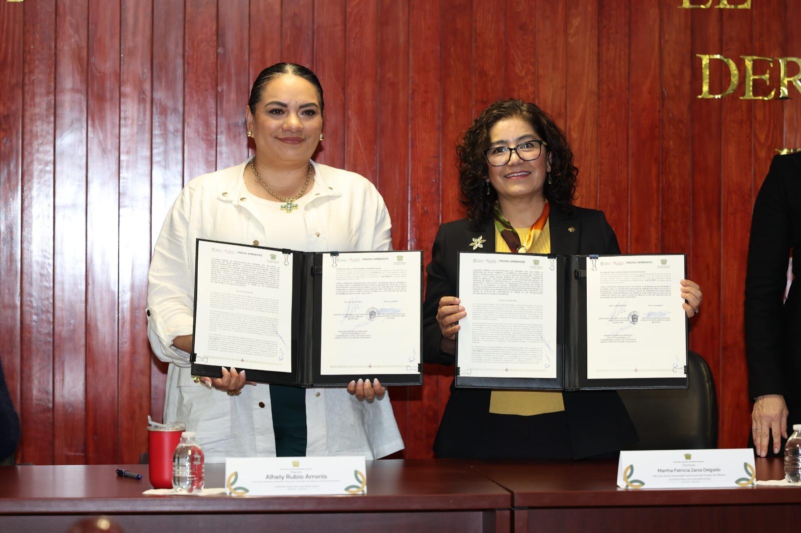 Amecameca, Méx.- Para impulsar el desarrollo sostenible y fortalecimiento de la responsabilidad medioambiental en beneficio y servicio de la sociedad, la rectora de la Universidad Autónoma del Estado de México (UAEMéx), Martha Patricia Zarza Delgado, y la Secretaria del Medio Ambiente y Desarrollo Sostenible estatal, Alhely Rubio Arronis, firmaron un convenio general de participación.