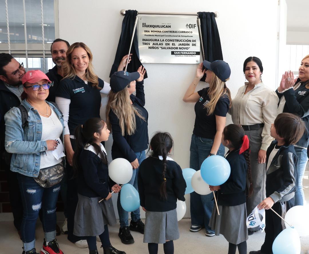 Huixquilucan, Méx.- La presidenta municipal, Romina Contreras Carrasco, hizo la entrega de tres nuevas aulas al Jardín de Niños “Salvador Novo”, en la colonia San Fernando, obra que ofrecerá un espacio digno y seguro para la niñez del municipio, y en especial de esta colonia.