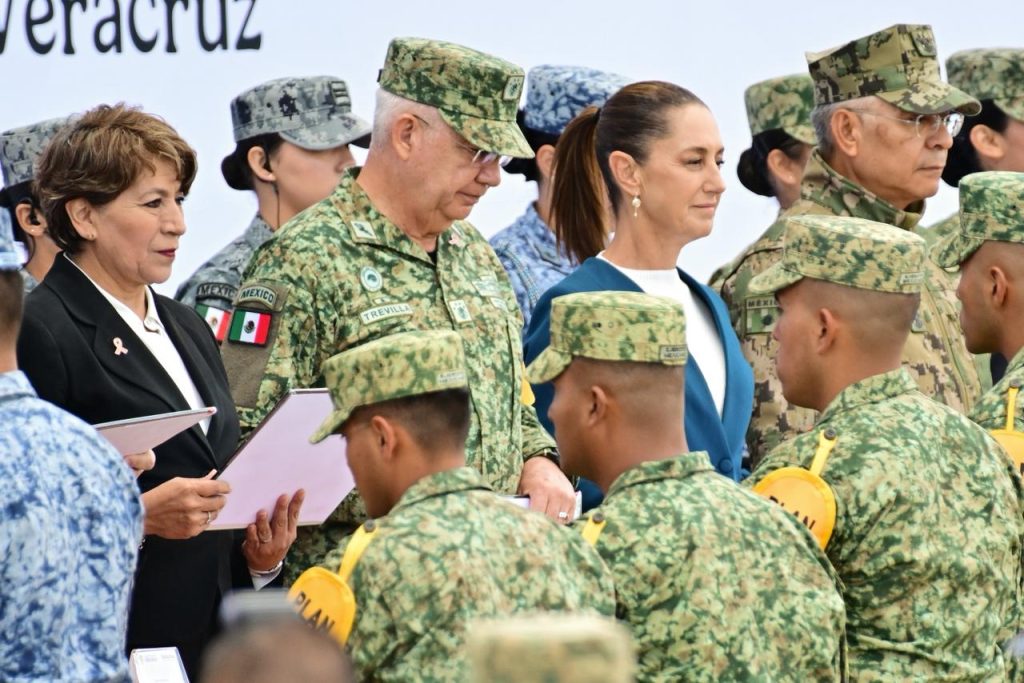 Es del evento en la Plataforma del Centro Estratégico Militar de Acopio de Santa Lucía en Zumpango, donde la presidenta de México, CLAUDIA SHEINBAUM, acompañada de la gobernadora mexiquense, DELFINA GÓMEZ, reconocieron al personal, que en octubre, participó en tareas de Protección Civil en auxilio a la población afectada por las lluvias en los estados de Hidalgo, Puebla, Querétaro, San Luis Potosí y Veracruz.
