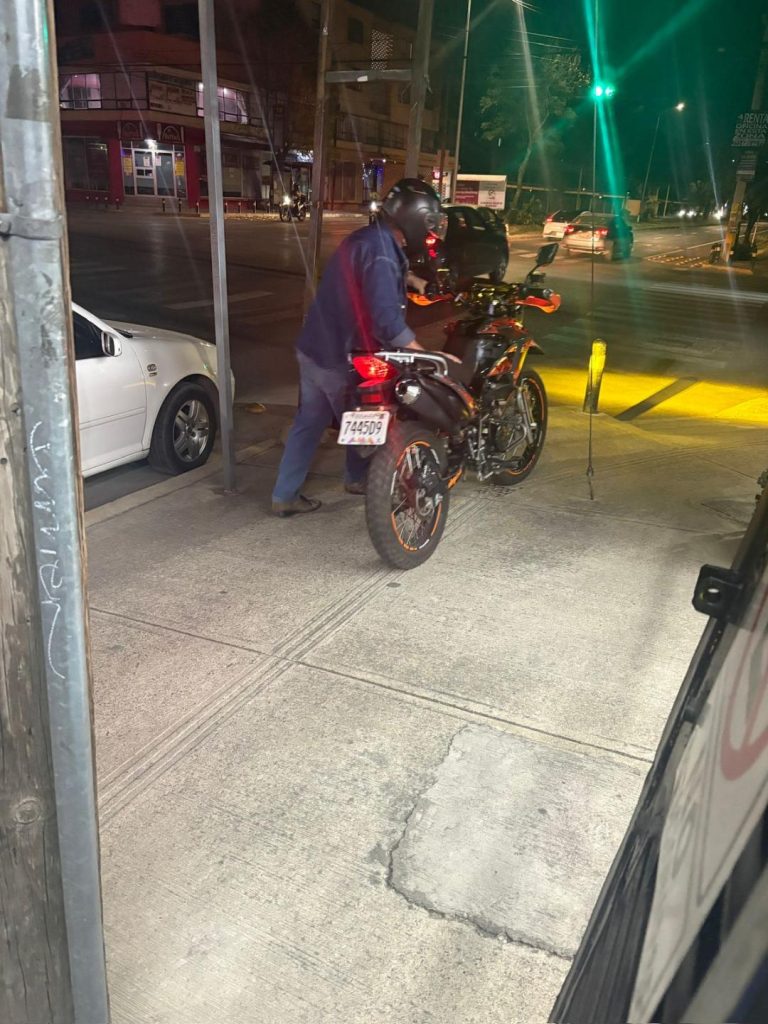 Un sedicente integrante del Cártel Jalisco Nueva Generación (CJNG), en motocicleta vento, naranja con luces ámbar, casco negro, caucasico, 1.70, aproximadamente unos 55 años, poco pelo, piel rosácea y nariz grande ha sido visto varias veces, mientras –supuestamente – trata de cobrar derecho de piso a negocios de San Manuel.