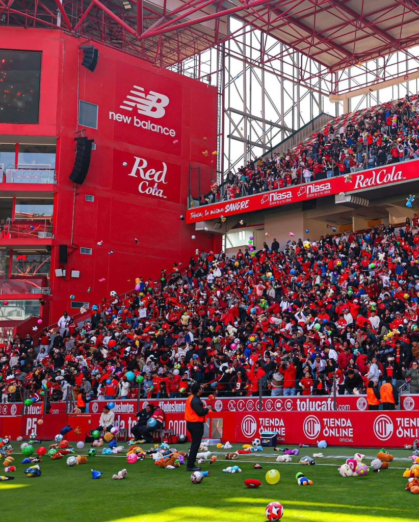 Desde temprana hora, familias enteras comenzaron a llegar al inmueble de la avenida Morelos con una consigna clara: disfrutar del entrenamiento del equipo escarlata y, al mismo tiempo, llevar un juguete para donarlo a los niños que más lo necesitan. El resultado fue una postal memorable, con el césped del “Infierno” cubierto por una lluvia de muñecas, balones, peluches y todo tipo de juguetes, reflejo del compromiso social de la afición toluqueña.