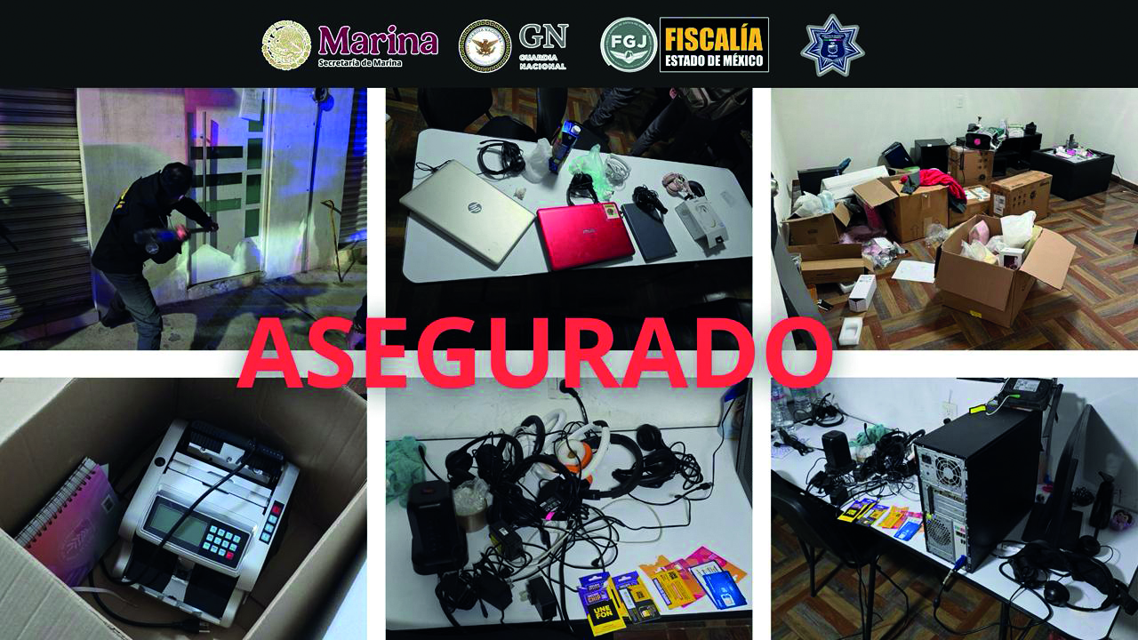Ecatepec, Méx.- Elementos de la Secretaría de Marina (MARINA), Guardia Nacional (GN), Fiscalía General de Justicia del Estado de México (FGJEM) y de la policía municipal aseguraron, a través de técnica de investigación de cateo, un inmueble que fungía como “call center”, y que estaría relacionado con el delito de extorsión y fraude bancario.