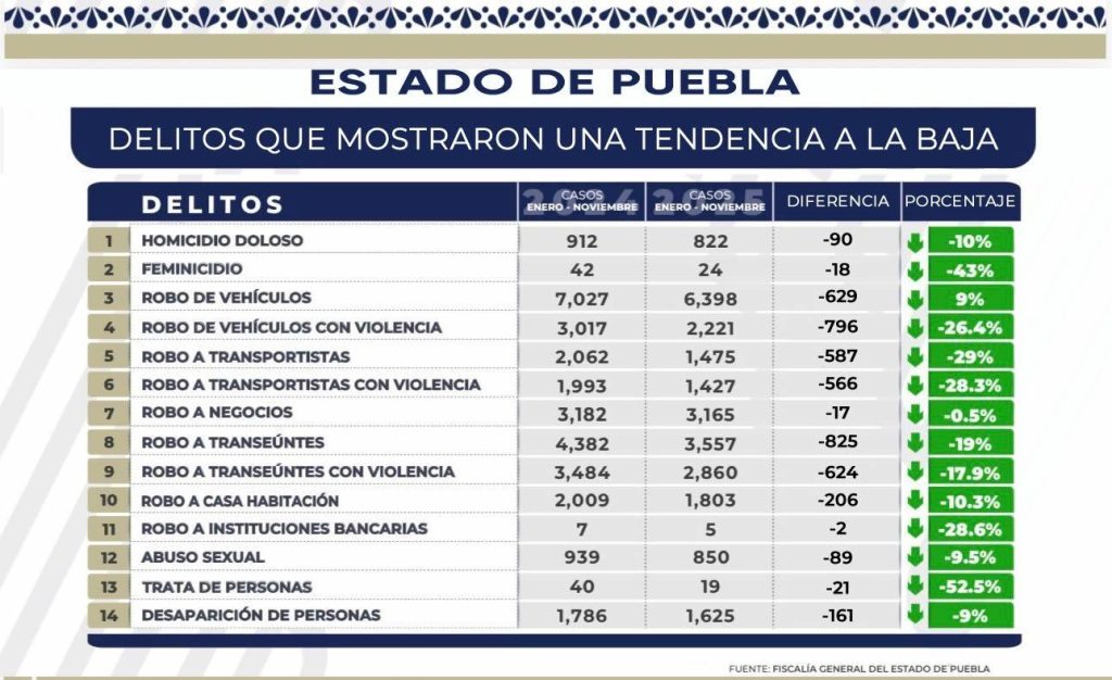 Porque en 2025 Puebla logró reducir sus índices en varios de los crímenes con mayor afectación a la gente, como homicidio doloso, feminicidios, abuso sexual, desaparición y trata de personas, robos de vehículos, negocios, transeúntes, a transportistas, en casa habitación, bancos, etc: