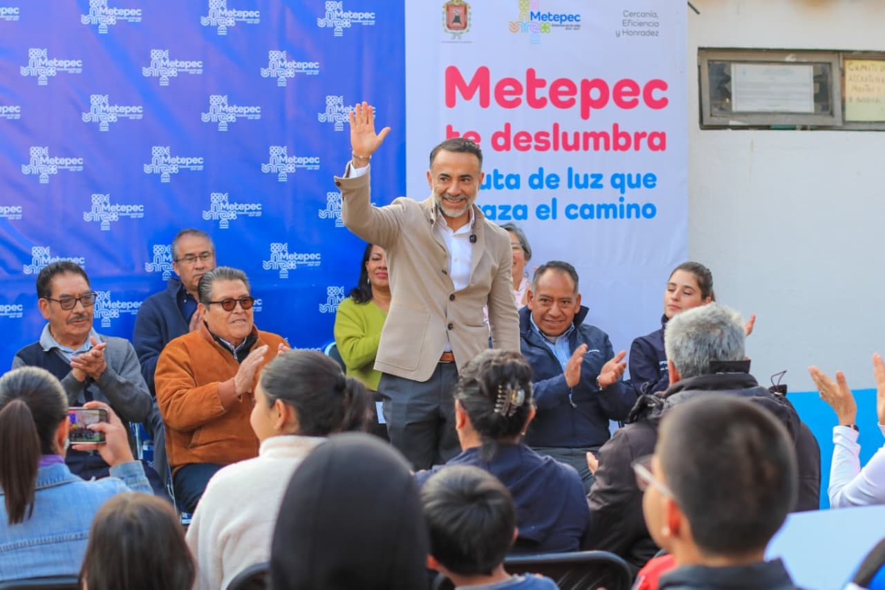 Metepec, Méx.- Con el objetivo de consolidar espacios públicos dignos y funcionales, el presidente municipal Fernando Flores Fernández encabezó una gira de trabajo en la colonia Agrícola Lázaro Cárdenas, donde entregó la rehabilitación integral del parque, la Delegación, la oficina del Comisariado Ejidal y el sistema de alumbrado de la Unidad Deportiva.