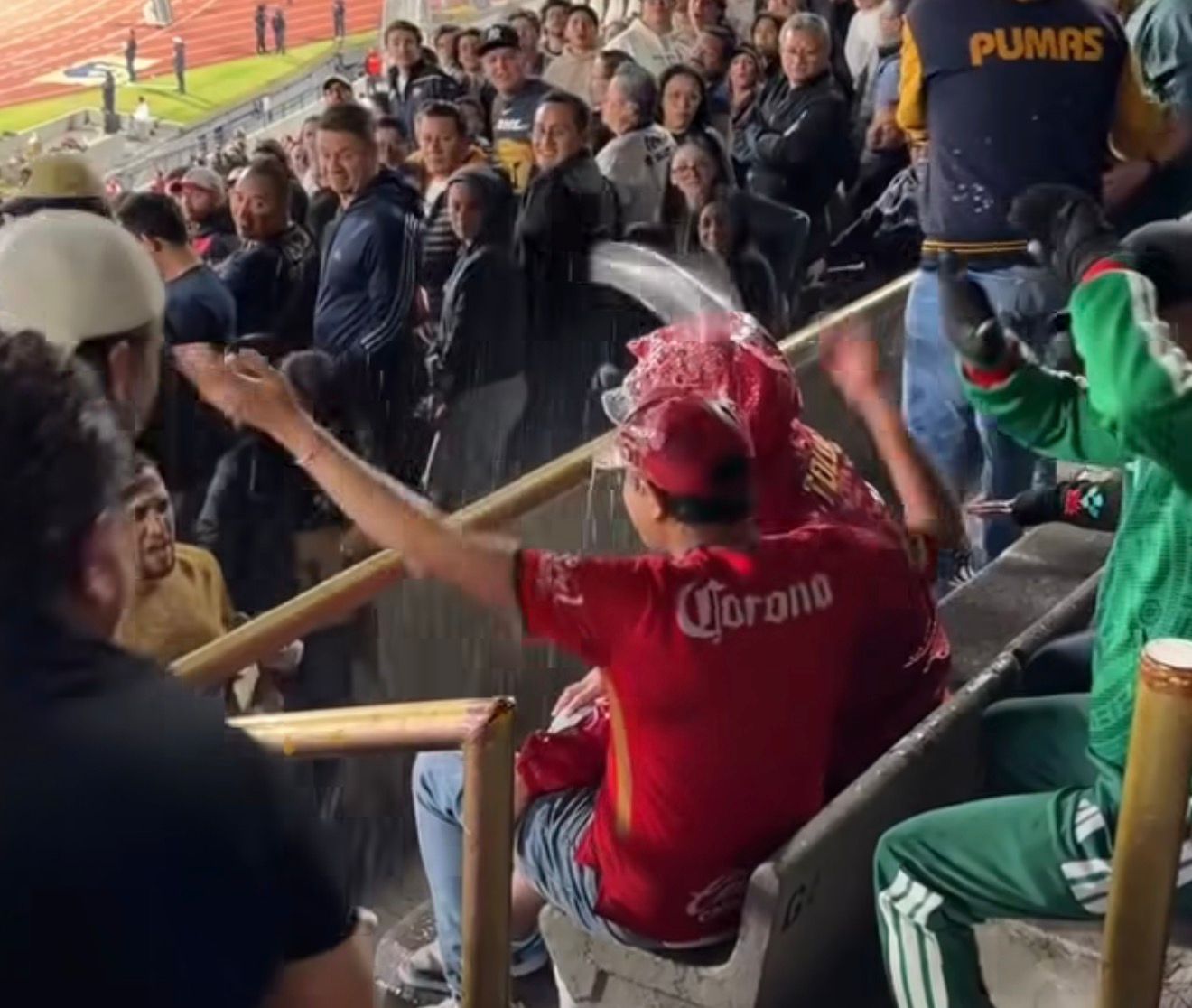 Las imágenes, que rápidamente se viralizaron en plataformas como TikTok, Facebook y X, muestran a varios aficionados de Pumas lanzando bebidas y algunos objetos hacia dos seguidores del Toluca que celebraban uno de los goles del equipo visitante. La escena generó momentos de tensión en la zona de gradas donde se encontraban ambos grupos de aficionados.