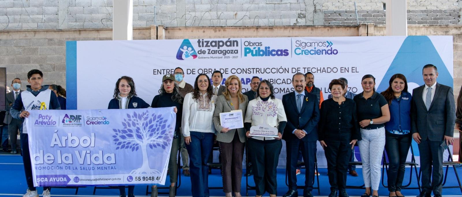 Atizapán, Méx,- El alcalde Pedro Rodríguez Villegas, acompañado de la presidenta honoraria del Sistema Municipal DIF, Patricia Arévalo Rubio, hicieron entrega del Distintivo “Árbol de la Vida” a la comunidad educativa del CBT Atizapán.