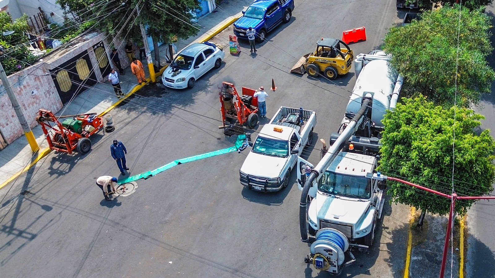 Las labores de desazolve se realizan mediante un esquema mixto que combina acciones manuales y el uso de equipo especializado, como unidades hidroneumáticas de presión-succión, malacates motorizados y equipos de bombeo para el achique de agua, lo que permite el retiro de sedimentos y materiales que obstruyen el correcto flujo del sistema de drenaje.