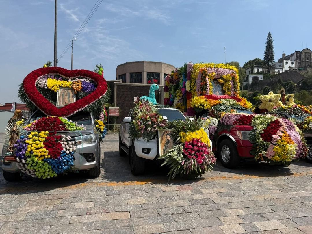 Entre flores y fe, floricultores de Tenancingo llegan a la Basílica con vehículos adornados