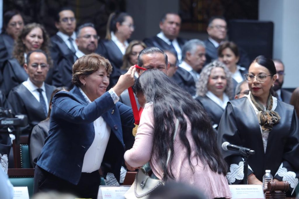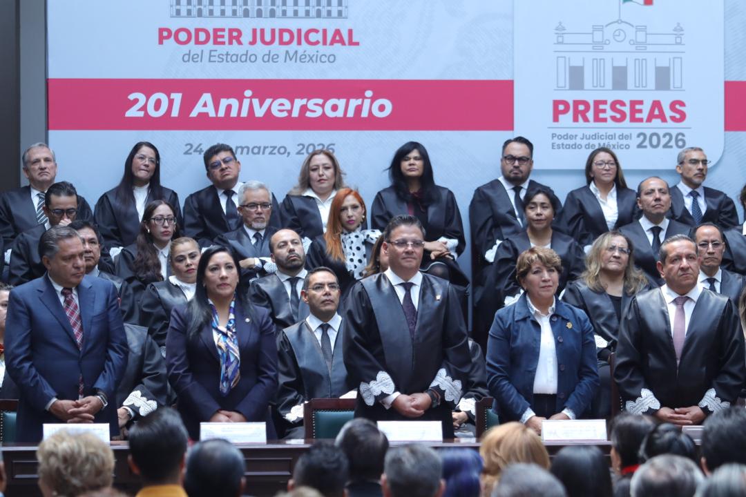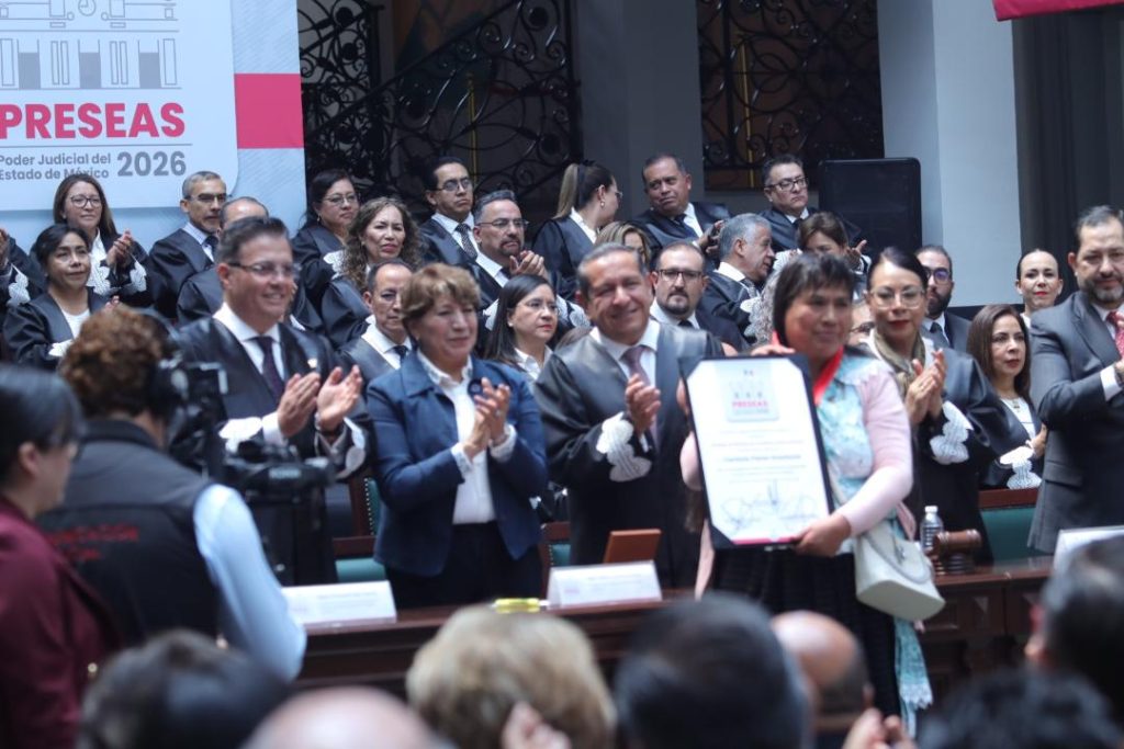 Toluca, Méx.- En el marco del 201 aniversario del Poder Judicial del Estado de México, la gobernadora Delfina Gómez Álvarez encabezó, junto con el magistrado Héctor Macedo García, la ceremonia de entrega de las Preseas del Poder Judicial 2026, un acto solemne en el que se reconoció la trayectoria, compromiso y vocación de servicio de juristas, académicos y profesionales del derecho.