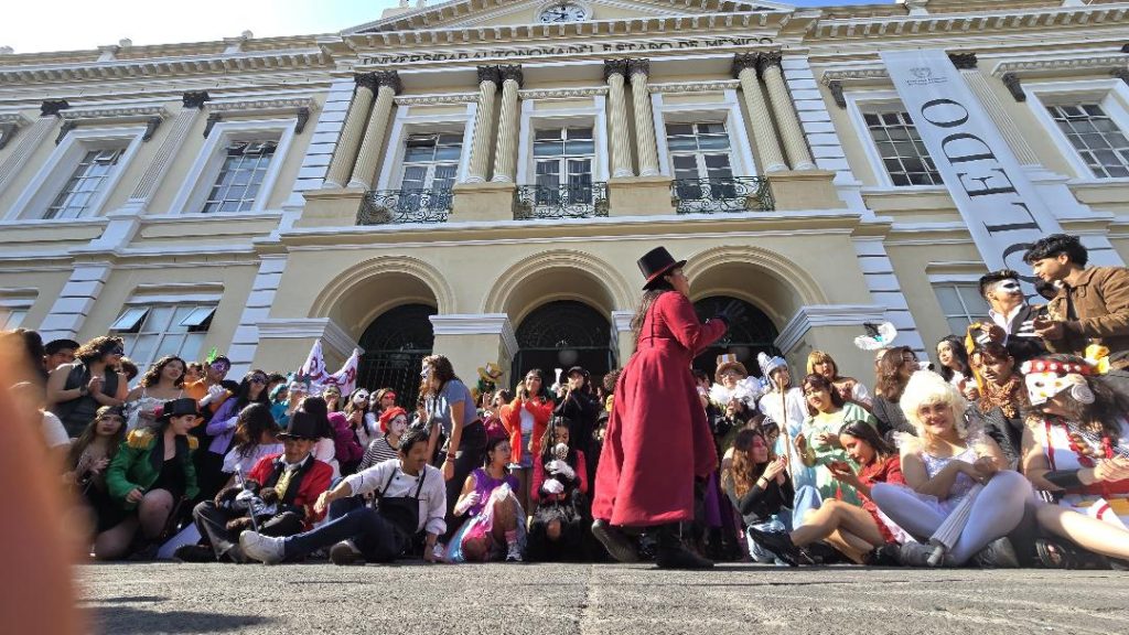 Toluca, Méx.- Entre batucada y una gran fiesta, una caravana artística, integrada por estudiantes, creadores escénicos y colectivos independientes, llenó de vida y expresión las calles de la capital mexiquense en el Día Mundial del Teatro.