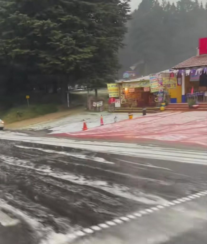 Toluca, Méx.- La fuerte granizada que se registró en la zona de La Marquesa dejó completamente cubierta de blanco la autopista México–Toluca, generando tránsito lento y condiciones de riesgo para automovilistas en ambos sentidos.