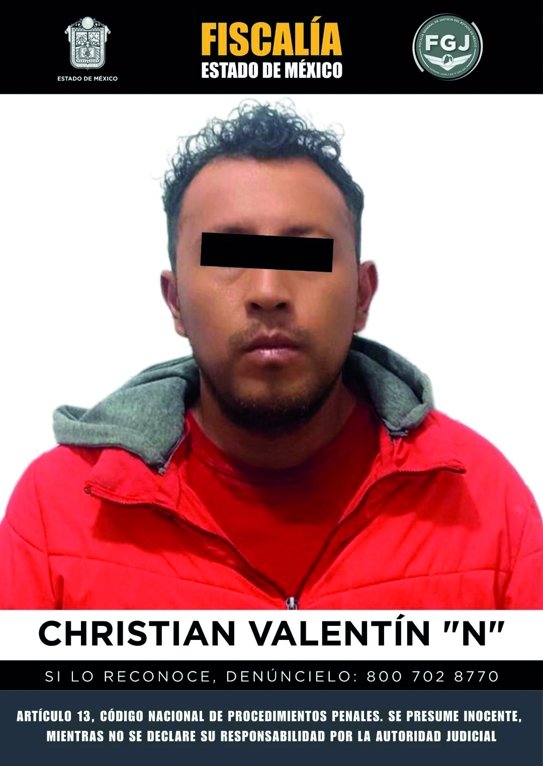 Por lo que, la Fiscalía tuvo conocimiento de estos hechos inició la investigación que permitió identificar a Christian Valentín “N” como posible partícipe de estos hechos, por lo que solicitó y obtuvo de una Autoridad Judicial orden de aprehensión en su contra.