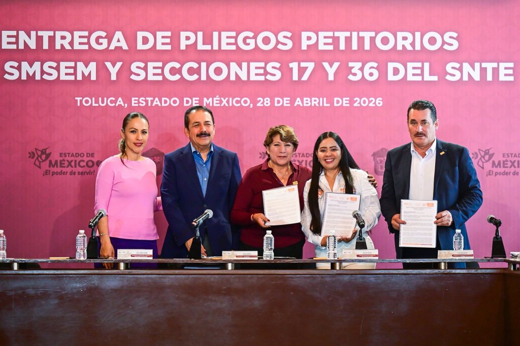 Toluca, Méx.- En un acto marcado por el diálogo institucional y el reconocimiento mutuo, la gobernadora Delfina Gómez Álvarez recibió los pliegos petitorios del Sindicato de Maestros al Servicio del Estado de México (SMSEM) y de las secciones 17 y 36 del Sindicato Nacional de Trabajadores de la Educación (SNTE), con el compromiso de revisar sus demandas y avanzar en la mejora de las condiciones laborales del magisterio mexiquense.
