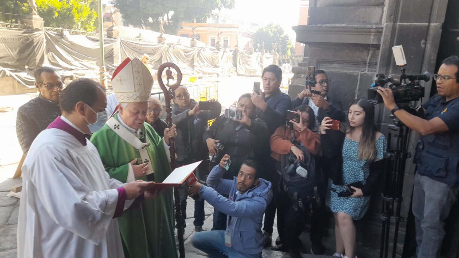 Hacen acto de desagravio en la puerta quemada de la Catedral de Puebla